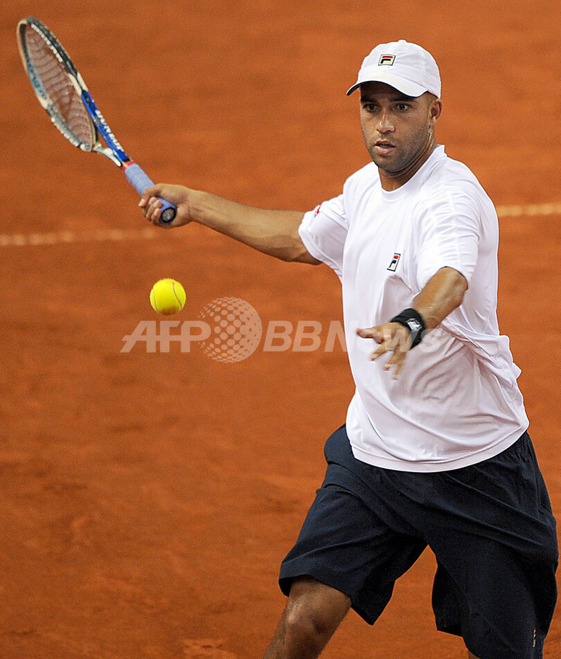 第5試合は米国のボブ・ブライアン(%%Bob Bryan%%)が5-7、6-3、7-6でロコ・カラヌシッチ(%%Roko Karanusic%%)に勝利した。写真は第4試合でボールを打ち返すジェームス・ブレーク。(2009年7月12日撮影)(c)AFP/HRVOJE POLAN