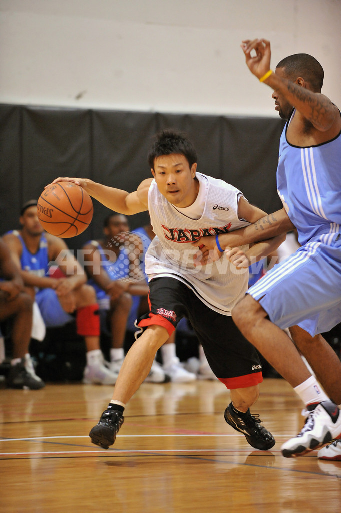 8月6日に開幕する第25回FIBAアジアバスケットボール選手権大会(%%The 25th FIBA Asia Championship for Men%%)に向け、米ラスベガス(Las Vegas)で強化合宿を行なっている男子バスケットボール日本代表が12日、NBAデベロップメントリーグ(NBA Development league:NBADL)選抜と試合を行なった。日本代表は74-105で敗れた。写真はドリブルする日本の竹田謙(%%Ken Takeda%%、左)。(2009年7月12日撮影)(c)AFP/Getty Images/Garrett W. Ellwood