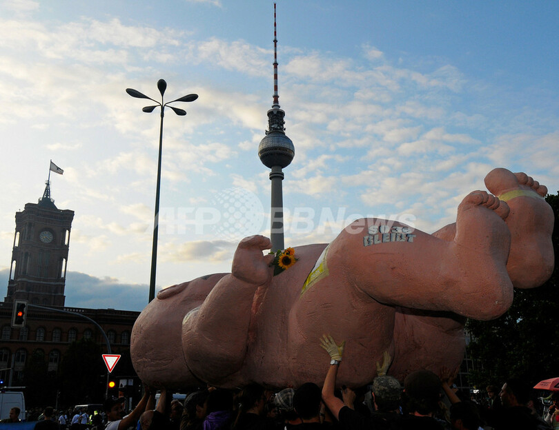 ニュース ライフ こぼれ話 巨大な赤ちゃんが河岸開発に抗議 2009年7月13日 12:33 発信地:ベルリン/ドイツ [ ヨーロッパ ドイツ ] このニュースをシェア ‹ › ❮ 2/4 ❯ ドイツ・ベルリン(Berlin)のシュプレー(Spree)川で11日、開発計画に反対する人々が巨大な赤ちゃんの人形を用いて抗議活動を行った。写真は、市庁舎の前を行進する人々が担ぎ上げた巨大な赤ちゃんの人形(2009年7月11日撮影)。(c)AFP/BERTHOLD STADLER 画像作成中 ! 【7月13日 AFP】ドイツ・ベルリン(Berlin)のシュプレー(Spree)川で11日、河岸開発計画に反対する人々が巨大な赤ちゃんの人形を用いて抗議活動を行った。(c)AFP ライフ 一覧へ> メディア・報道関係・法人の方向け 写真・動画 購入のお問合せ>
