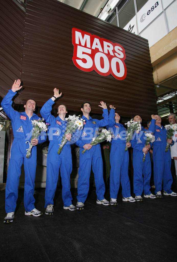 本物の宇宙飛行士に見まがう青いオーバーオールを身につけたロシア人4人、フランス人とドイツ人各1人の計6人は、この日、外界から遮断された105日間の実験生活を終え、にこやかに「宇宙船」から出てきて、花束を受け取った。全員、健康そうだ。