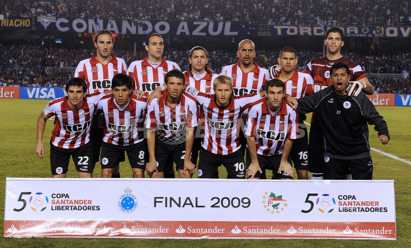 サッカーリベルタドーレス杯2009(%%Copa Libertadores de America 2009%%)決勝、クルゼイロEC(%%Cruzeiro EC%%、ブラジル)対エストゥディアンテス(%%Estudiantes%%、アルゼンチン)第2戦。試合はエストゥディアンテスが2-1で勝利し、0-0のスコアレスドローに終わった第1戦との2試合合計スコアを2-1として通算4度目の優勝を飾った。写真は試合前の写真撮影に臨むエストゥディアンテスの選手。(2009年7月15日撮影)(c)AFP/VANDERLEI ALMEIDA