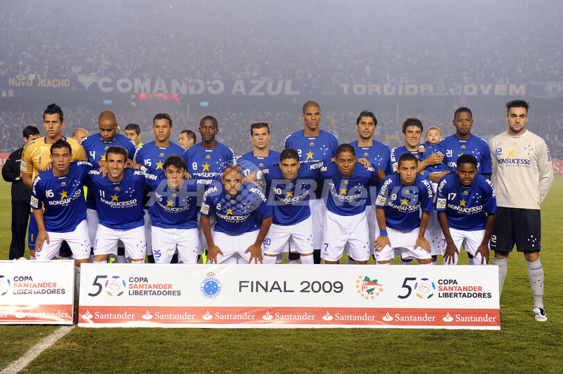 サッカーリベルタドーレス杯2009(%%Copa Libertadores de America 2009%%)決勝、クルゼイロEC(%%Cruzeiro EC%%、ブラジル)対エストゥディアンテス(%%Estudiantes%%、アルゼンチン)第2戦。試合はエストゥディアンテスが2-1で勝利し、0-0のスコアレスドローに終わった第1戦との2試合合計スコアを2-1として通算4度目の優勝を飾った。写真は試合前の写真撮影に臨むクルゼイロEC。(2009年7月15日撮影)(c)AFP/Evaristo Sa