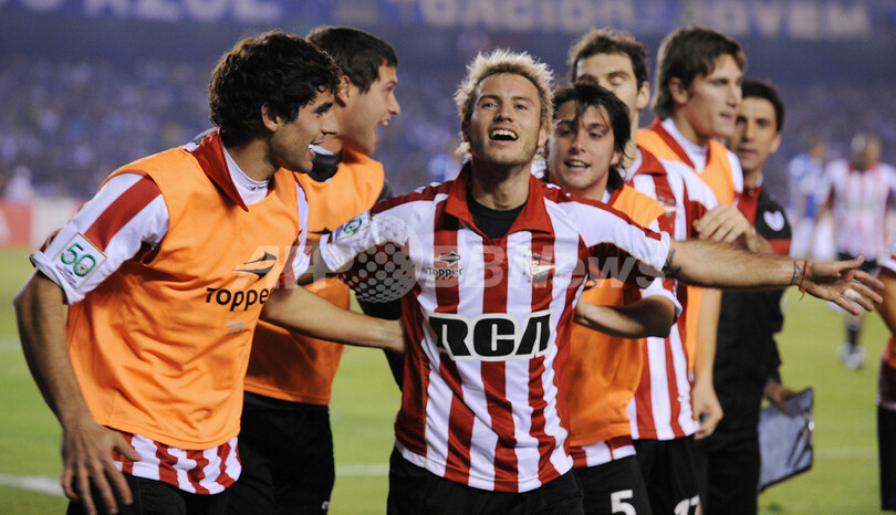 サッカーリベルタドーレス杯2009(%%Copa Libertadores de America 2009%%)決勝、クルゼイロEC(%%Cruzeiro EC%%、ブラジル)対エストゥディアンテス(%%Estudiantes%%、アルゼンチン)第2戦。試合はエストゥディアンテスが2-1で勝利し、0-0のスコアレスドローに終わった第1戦との2試合合計スコアを2-1として通算4度目の優勝を飾った。写真は後半12分に同点ゴールを決めてチームメイトと歓喜するエストゥディアンテスのガストン・フェルナンデス(%%Gaston Fernandez%%)。(2009年7月15日撮影)(c)AFP/VANDERLEI ALMEIDA
