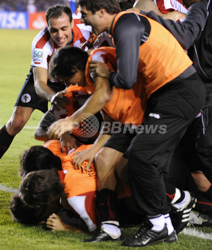 サッカーリベルタドーレス杯2009(%%Copa Libertadores de America 2009%%)決勝、クルゼイロEC(%%Cruzeiro EC%%、ブラジル)対エストゥディアンテス(%%Estudiantes%%、アルゼンチン)第2戦。試合はエストゥディアンテスが2-1で勝利し、0-0のスコアレスドローに終わった第1戦との2試合合計スコアを2-1として通算4度目の優勝を飾った。写真は後半28分にマウロ・ボセッリ(%%Mauro Boselli%%)の逆転ゴールに歓喜するエストゥディアンテスの選手。(2009年7月15日撮影)(c)AFP/VANDERLEI ALMEIDA