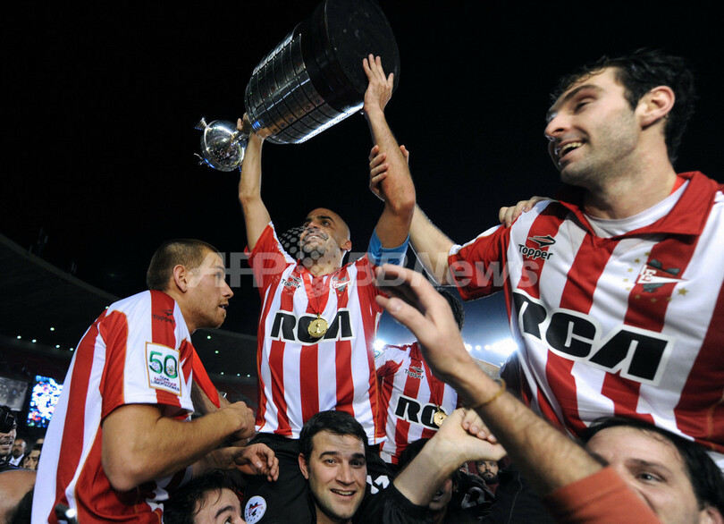 サッカーリベルタドーレス杯2009(%%Copa Libertadores de America 2009%%)決勝、クルゼイロEC(%%Cruzeiro EC%%、ブラジル)対エストゥディアンテス(%%Estudiantes%%、アルゼンチン)第2戦。試合はエストゥディアンテスが2-1で勝利し、0-0のスコアレスドローに終わった第1戦との2試合合計スコアを2-1として通算4度目の優勝を飾った。写真は優勝トロフィーを掲げるエストゥディアンテスのファン・セバスティアン・ベロン(%%Juan Sebastian Veron%%、中央)。(2009年7月15日撮影)(c)AFP/Evaristo Sa