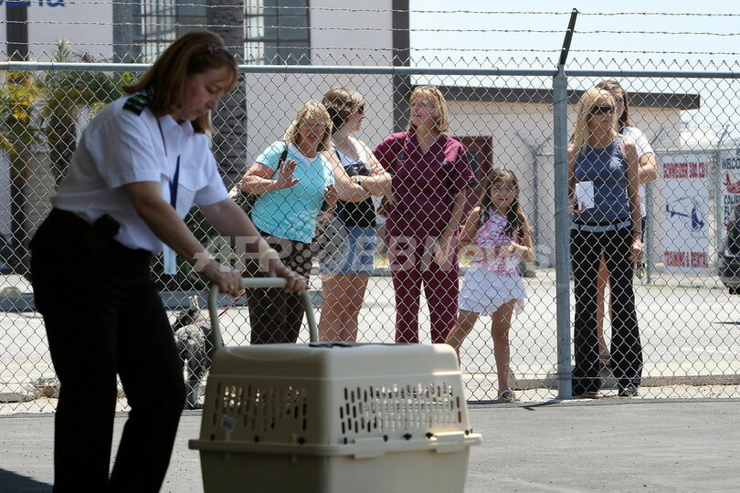 写真は、就航便に乗せられるペットを見守る飼い主ら(2009年7月16日撮影)。(c)AFP/Getty Images/David McNew