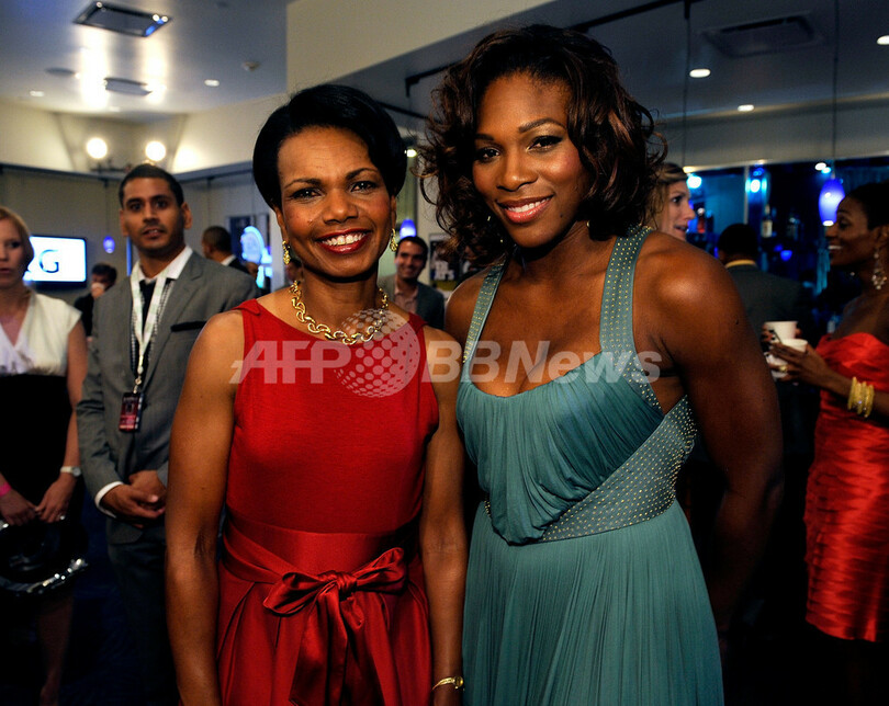 写真は、授賞式のバックステージでポーズをとる女子テニスのセレーナ・ウィリアムス(Serena Williams、右)とコンドリーザ・ライス(Condoleezza Rice)前米国務長官、2009年7月15日撮影)。(c)AFP/Getty Images for ESPY/Kevork Djansezian