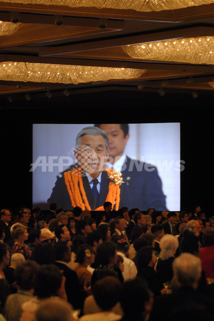 米ハワイ(Hawaii)を訪問中の天皇、皇后両陛下はホノルル(Honolulu)で15日、ハワイ王朝最後のリリウオカラニ(Liliuokalani)女王が居住していたイオラニ宮殿で開かれた晩さん会にリンダ・リングル(Linda Lingle)ハワイ州知事(右)らとともに出席した。写真は、晩さん会会場内のスクリーンに映し出された天皇陛下(2009年7月15日撮影)。(c)AFP/LUCY PEMONI