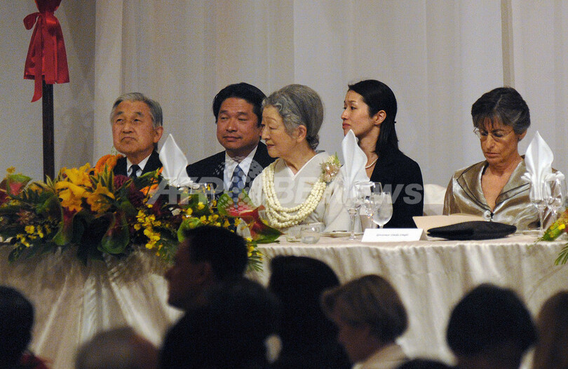 米ハワイ(Hawaii)を訪問中の天皇、皇后両陛下はホノルル(Honolulu)で15日、ハワイ王朝最後のリリウオカラニ(Liliuokalani)女王が居住していたイオラニ宮殿で開かれた晩さん会にリンダ・リングル(Linda Lingle)ハワイ州知事(右)らとともに出席した(2009年7月15日撮影)。(c)AFP/LUCY PEMONI