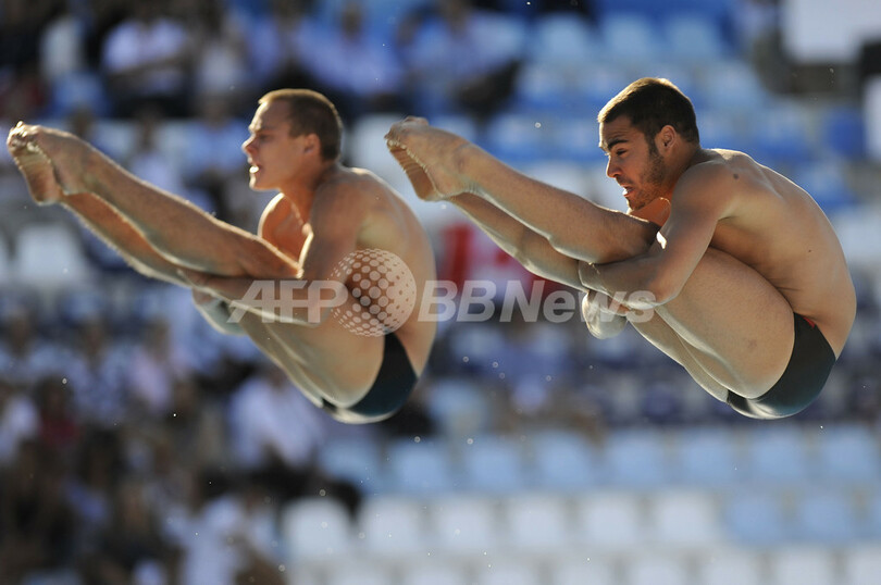 第13回世界水泳選手権(%%13th World Swimming Championships%%)男子シンクロ板飛び込み決勝。%%北京五輪%%の同種目で金メダルを獲得した中国の秦凱(%%Qin Kai%%、チン・カイ)/王峰(%%Wang Feng%%、ワン・フェン)組が、467.94点で大会2連覇を果たした。写真は428.64点を獲得して3位に入ったカナダのアレクサンダー・ディスパティエ(%%Alexandre Despatie%%)/ルーベン・ロス(%%Reuben Ross%%)組。(2009年7月18日撮影)(c)AFP/FILIPPO MONTEFORTE