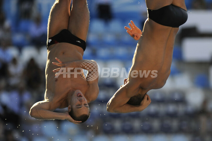 第13回世界水泳選手権(%%13th World Swimming Championships%%)男子シンクロ板飛び込み決勝。%%北京五輪%%の同種目で金メダルを獲得した中国の秦凱(%%Qin Kai%%、チン・カイ)/王峰(%%Wang Feng%%、ワン・フェン)組が、467.94点で大会2連覇を果たした。写真は428.64点を獲得して3位に入ったカナダのアレクサンダー・ディスパティエ(%%Alexandre Despatie%%)/ルーベン・ロス(%%Reuben Ross%%)組。(2009年7月18日撮影)(c)AFP/FILIPPO MONTEFORTE
