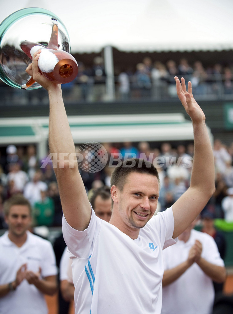 男子テニス、カテラ・スウェーデン・オープン(%%Catella Swedish Open 2009%%)シングルス決勝。大会第2シードのロビン・ソデルリング(%%Robin Soderling%%、スウェーデン)は、アルゼンチンのフアン・モナコ(%%Juan Monaco%%)と対戦。ソデルリングは6-3、7-6で勝利し、クレーコート初優勝を果たしてキャリア通算4勝目を飾った。写真は表彰式でトロフィーを掲げるロビン・ソデルリング。(2009年7月19日撮影)(c)AFP/SCANPIX/BJORN LARSSON ROSVALL