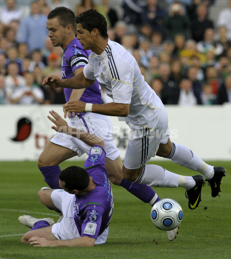 【7月21日 AFP】スペイン1部リーグのレアル・マドリード(Real Madrid)に移籍したクリスティアーノ・ロナウド(Cristiano Ronaldo)が20日、ダブリン(Dublin)で行なわれたシャムロック・ローバーズ(Shamrock Rovers)との親善試合でレアル移籍後初出場を果たした。