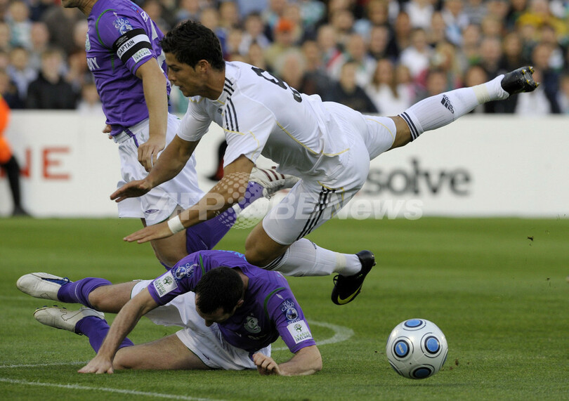 【7月21日 AFP】スペイン1部リーグのレアル・マドリード(Real Madrid)に移籍したクリスティアーノ・ロナウド(Cristiano Ronaldo)が20日、ダブリン(Dublin)で行なわれたシャムロック・ローバーズ(Shamrock Rovers)との親善試合でレアル移籍後初出場を果たした。