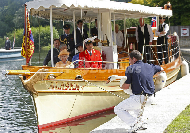 写真は、白鳥が川に還される様子を見つめるエリザベス女王(2009年7月20日撮影)。(c)AFP/WPA/Sang Tan