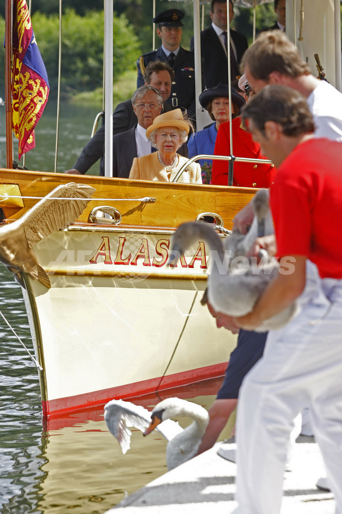 写真は、白鳥が川に還される様子を見つめるエリザベス女王(2009年7月20日撮影)。(c)AFP/WPA/Sang Tan