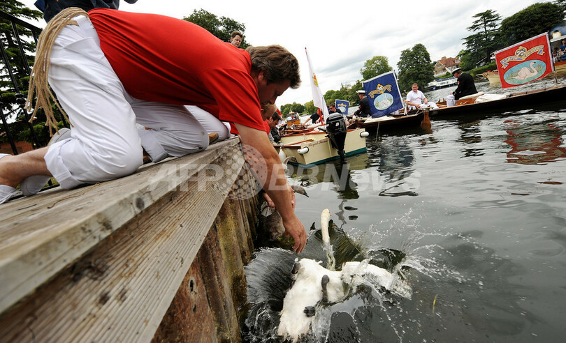 写真は、白鳥を川に還すスワンアッパー(2009年7月20日撮影)。(c)AFP/Carl de Souza
