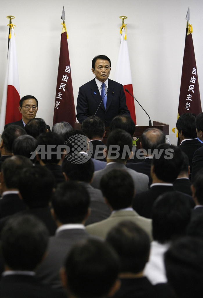 その一方で、引き続き党総裁の座にとどまり、党員と一致団結して8月の衆院選に臨む決意を示した。懇談会は当初非公開で行われる予定だったが、開催直前に公開が決まり、テレビでも放映された。(c)AFP