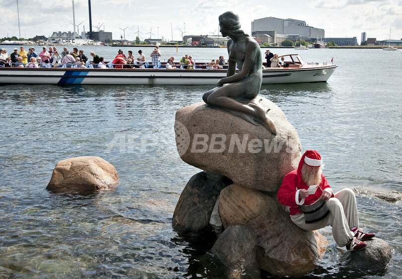 デンマーク・コペンハーゲン(Copenhagen)で3日間の日程で開催中の「世界サンタクロース会議(World Santa Claus Congress)」が2日目を迎えた。世界各国から136人の「サンタ代表団」が集まっている。写真は、コペンハーゲン港の「人魚姫」像のそばでくつろぐサンタのコスチュームを着た参加者(2009年7月21日撮影)。(c)AFP/SCANPIX/ CASPER CHRISTOFFERSEN