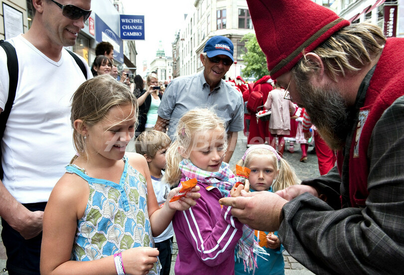 デンマーク・コペンハーゲン(Copenhagen)で3日間の日程で開催中の「世界サンタクロース会議(World Santa Claus Congress)」が2日目を迎えた。世界各国から136人の「サンタ代表団」が集まっている。写真は、子どもたちにお菓子を配る妖精姿の男性(2009年7月21日撮影)。(c)AFP/SCANPIX/ CASPER CHRISTOFFERSEN