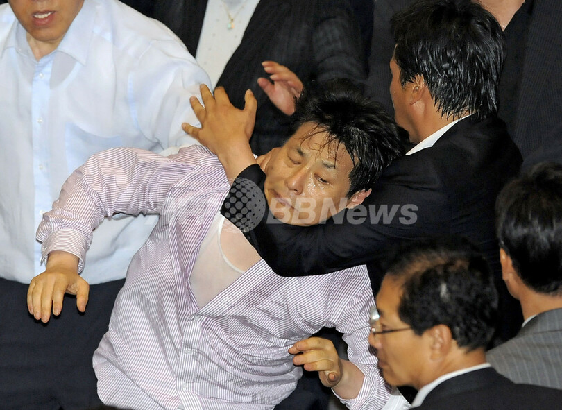 ニュース 政治・経済 韓国でメディア関連法案成立、強行採決で乱闘も 2009年7月22日 19:15 発信地:ソウル/韓国 [ 韓国・北朝鮮 韓国 ] このニュースをシェア ‹ › ❮ 4/9 ❯ 韓国国会で22日、与党ハンナラ党(Grand National Party、GNP)がメディア規制緩和法案を強行採決しようとしたため、与野党議員が国会で乱闘する騒ぎとなった。法案は可決されたが、十数人の負傷者が出た。写真は、与党議員らに引きずられる野党議員(中央、2009年7月22日撮影)。(c)AFP/JUNG YEON-JE 画像作成中 ! 【7月22日 AFP】韓国国会で22日、与党ハンナラ党(Grand National Party、GNP)がメディア規制緩和法案を強行採決しようとしたため、与野党議員が国会で乱闘する騒ぎとなった。(c)AFP 政治・経済 一覧へ> メディア・報道関係・法人の方向け 写真・動画 購入のお問合せ>