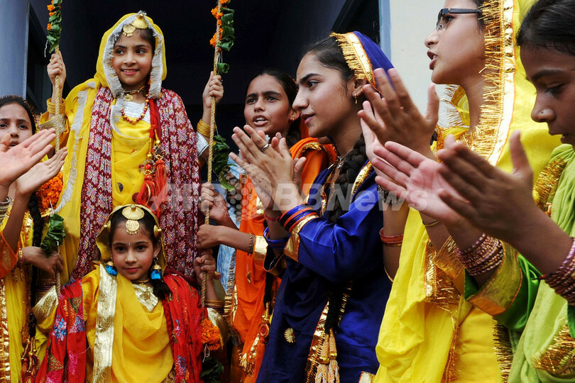 インド・アムリツァル(Amritsar)で25日、ヒンズー教の祭り「ティージ(Teej)」が開催された。雨期の到来を歓迎するティージ祭は、女性に特に人気で、美しい衣装を着た女性たちが歌や踊りを披露する。写真は、パンジャブ(Punjabi)人の民族衣装を着る女子学生たち(2009年7月25日撮影)。(c)AFP/NARINDER NANU