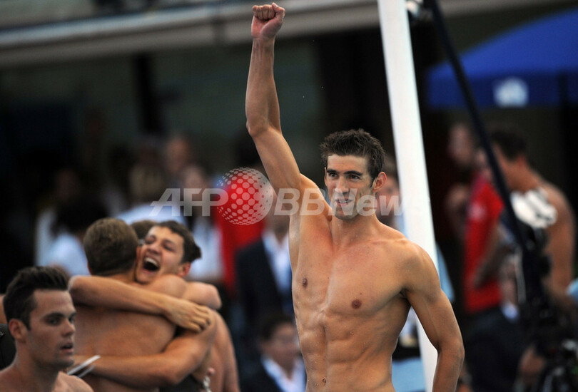2位には3分09秒52でロシアが入った。%%北京五輪%%・男子100メートル自由形金メダリストのアラン・ベルナール(%%Alain Bernard%%)を擁したフランスは、3分09秒89で3位だった。写真は優勝を喜ぶ米国のマイケル・フェルプス(右)。(2009年7月26日撮影)(c)AFP/CHRISTOPHE SIMON