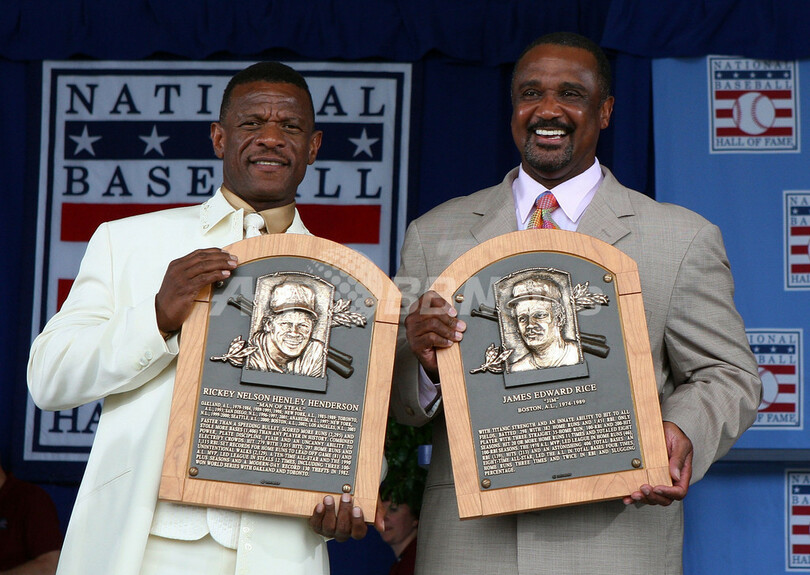 【7月27日 AFP】2009年の野球殿堂入り(Baseball Hall of Fame)表彰式典が26日、ニューヨーク州クーパーズタウン(Cooperstown)で行なわれ、米大リーグ(MLB)の歴代最多盗塁記録を持つリッキー・ヘンダーソン(Rickey Henderson)氏と、1970年代後半から1980年代にボストン・レッドソックス(Boston Red Sox)のスラッガーとして活躍したジム・ライス(Jim Rice)氏が殿堂入りし、表彰を受けた。(c)AFP