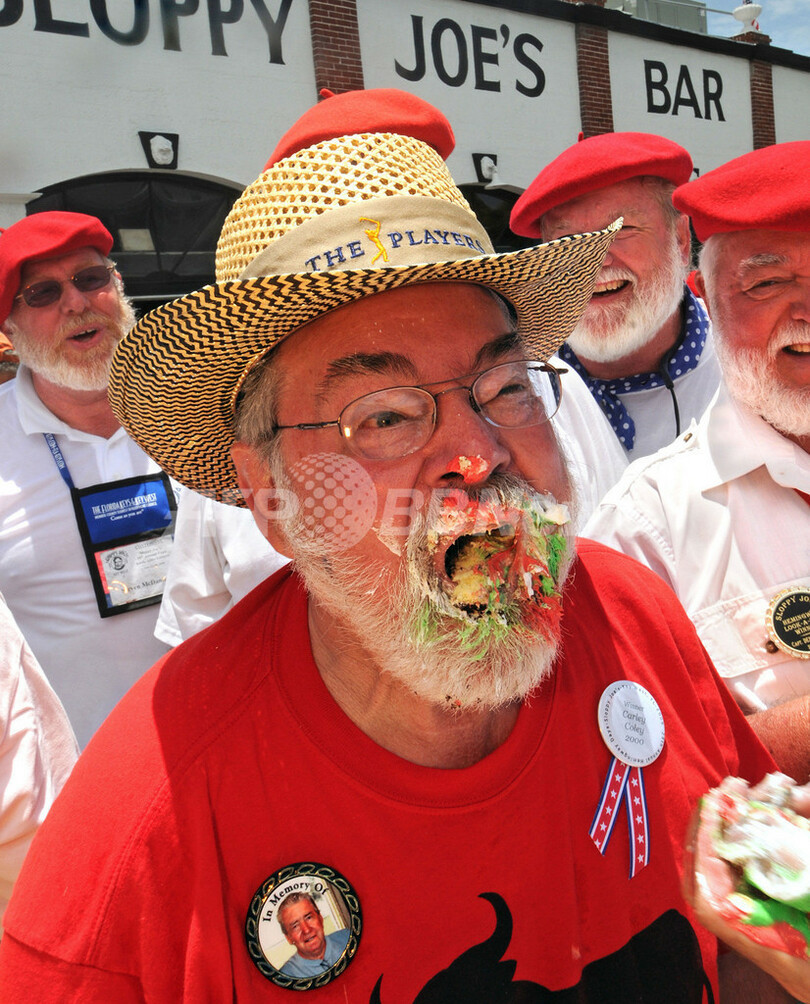 写真は、コンテスト会場のスロッピー・ジョーズ・バー(Sloppy Joe's Bar)前で、ケーキを食べる2000年の優勝者、カーリー・コーリー(Carlie Coley)さん(2009年7月25日撮影)。(c)AFP/Andy Newman/Florida Keys News Bureau