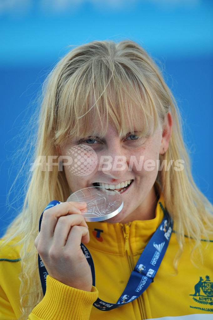 2位には56秒23でジェシカ・シッパー(%%Jessicah Schipper%%、オーストラリア)、3位には56秒86で焦劉洋(%%Liuyang Jiao%%、中国)が入った。写真は表彰台でメダルを手にしてポーズをとる2位のジェシカ・シッパー。(2009年7月27日撮影)(c)AFP/MARTIN BUREAU