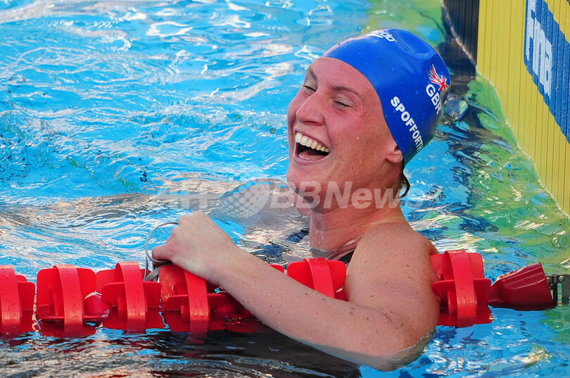 2位には58秒18でズエワ、3位には58秒88でエミリー・シーボーン(%%Emily Seebohm%%、オーストラリア)が入った。写真は世界新記録で優勝を果たし歓喜するジェマ・スポフォース。(2009年7月28日撮影)(c)AFP/ALBERTO PIZZOLI