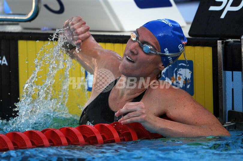 2位には58秒18でズエワ、3位には58秒88でエミリー・シーボーン(%%Emily Seebohm%%、オーストラリア)が入った。写真は世界新記録で優勝を果たし歓喜するジェマ・スポフォース。(2009年7月28日撮影)(c)AFP/MARTIN BUREAU