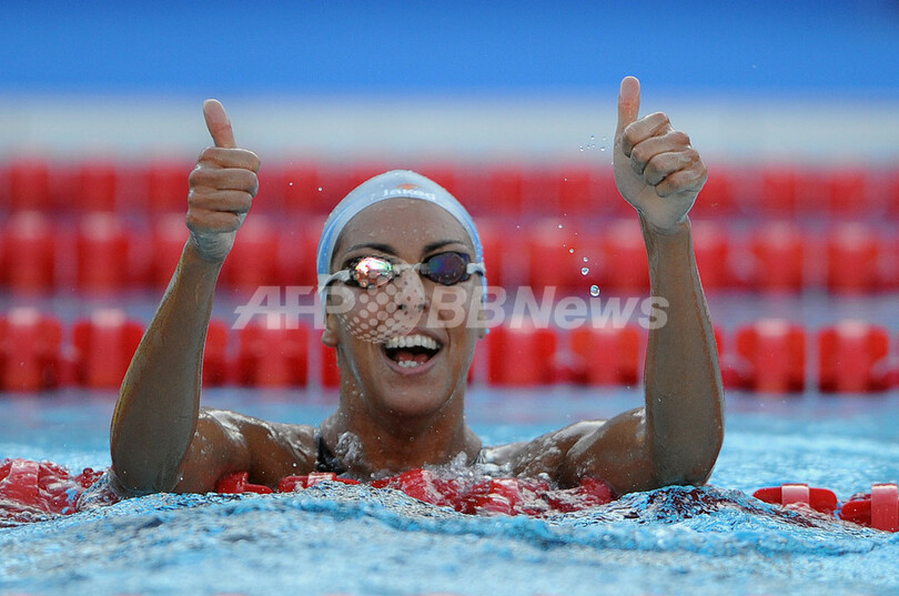 2位には15分46秒30でロッテ・フリース(%%Lotte Friis%%、デンマーク)、3位には15分55秒63でカメリア・ポテク(%%Camelia Potec%%、ルーマニア)が入った。写真は優勝を喜ぶアレッシア・フィリッピ。(2009年7月28日撮影)(c)AFP/FRANCOIS XAVIER MARIT
