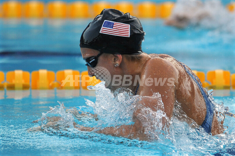 2位には1分05秒41でユリア・エフィモワ(%%Yuliya Efimova%%、ロシア)が、3位には1分05秒75でケーシー・カールソン(%%Kasey Carlson%%、米国)が入った。(2009年7月28日撮影)(c)AFP/CHRISTOPHE SIMON