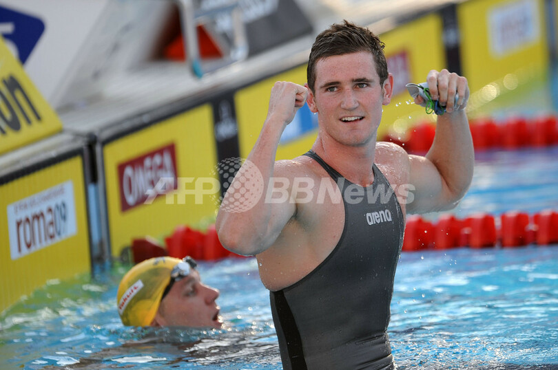 ファン・デル・バーグは、2009年5月にフェリペ・フランサ・ダ・シウヴァ(%%Felipe Franca da Silva%%、ブラジル)が樹立した世界記録26秒89を更新した。写真は世界新記録を樹立して喜ぶキャメロン・ファン・デル・バーグ。(2009年7月28日撮影)(c)AFP/CHRISTOPHE SIMON