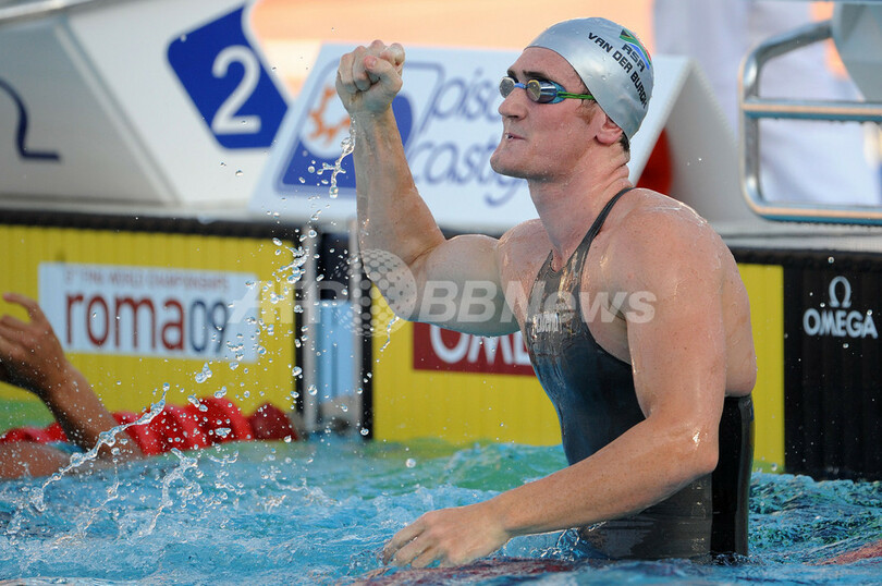 ファン・デル・バーグは、2009年5月にフェリペ・フランサ・ダ・シウヴァ(%%Felipe Franca da Silva%%、ブラジル)が樹立した世界記録26秒89を更新した。写真は世界新記録を樹立して喜ぶキャメロン・ファン・デル・バーグ。(2009年7月28日撮影)(c)AFP/MARTIN BUREAU