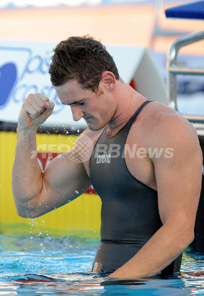 ファン・デル・バーグは、2009年5月にフェリペ・フランサ・ダ・シウヴァ(%%Felipe Franca da Silva%%、ブラジル)が樹立した世界記録26秒89を更新した。写真は世界新記録を樹立して喜ぶキャメロン・ファン・デル・バーグ。(2009年7月28日撮影)(c)AFP/MARTIN BUREAU