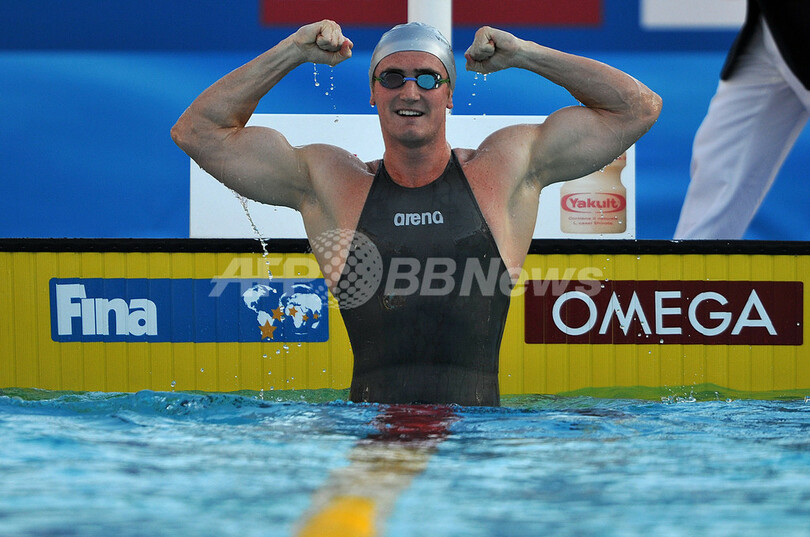 ファン・デル・バーグは、2009年5月にフェリペ・フランサ・ダ・シウヴァ(%%Felipe Franca da Silva%%、ブラジル)が樹立した世界記録26秒89を更新した。写真は世界新記録を樹立して喜ぶキャメロン・ファン・デル・バーグ。(2009年7月28日撮影)(c)AFP/FILIPPO MONTEFORTE