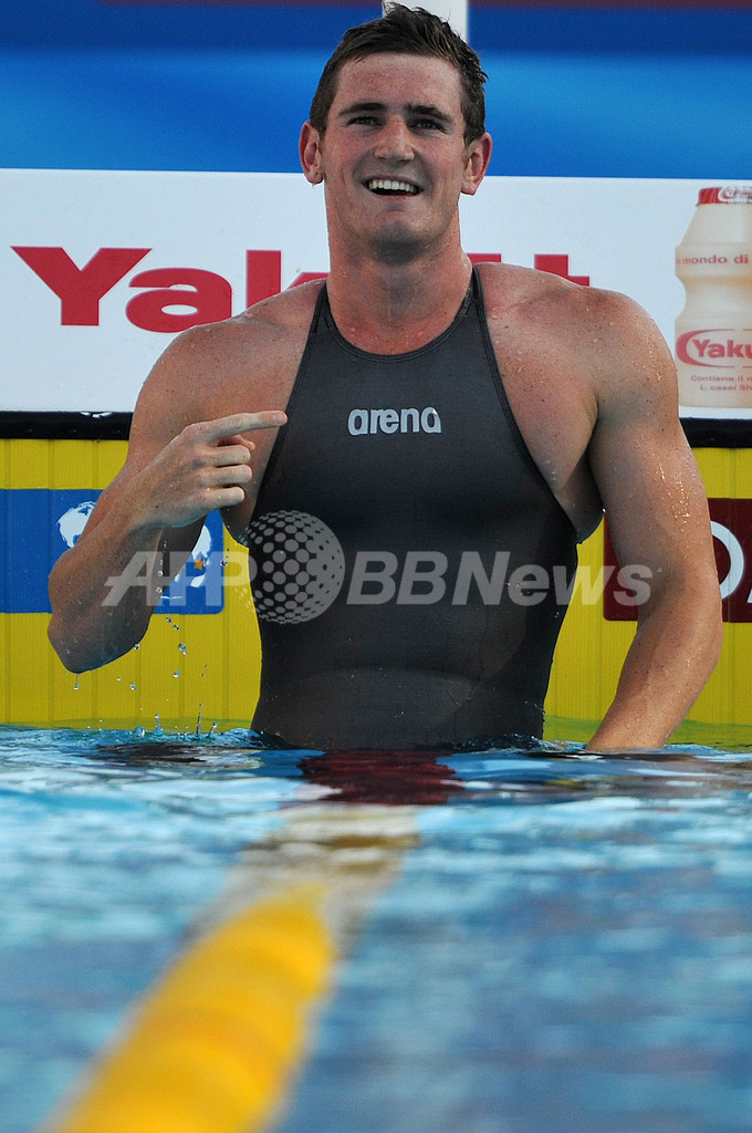 ファン・デル・バーグは、2009年5月にフェリペ・フランサ・ダ・シウヴァ(%%Felipe Franca da Silva%%、ブラジル)が樹立した世界記録26秒89を更新した。写真は世界新記録を樹立して喜ぶキャメロン・ファン・デル・バーグ。(2009年7月28日撮影)(c)AFP/FILIPPO MONTEFORTE