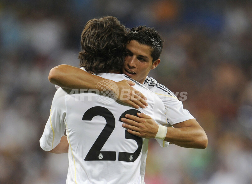 レアル・マドリードは、世界最高額の移籍金でチームに加入したクリスティアーノ・ロナウド(%%Cristiano Ronaldo%%)が、後半3分に自らが得たペナルティーキック(PK)を決めて、移籍後初ゴールを挙げるなどで4点を奪った。写真は後半8分にチームの2点目を決めてクリスティアーノ・ロナウド(右)と喜ぶレアル・マドリードのエステバン・グラネロ(%%Esteban Granero%%)。(2009年7月28日撮影)(c)AFP/PIERRE-PHILIPPE MARCOU