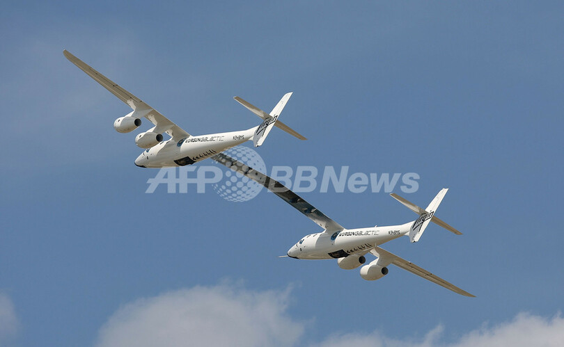 米ウィスコンシン(Wisconsin)州オシュコシュ(Oshkosh)で28日、エクスペリメンタル航空機協会(Experimental Aircraft Association)が主催する毎年恒例の航空ショーが開催された。写真は、宇宙旅行会社「ヴァージン・ギャラクティック(Virgin Galactic)」が企画する宇宙旅行用の有人宇宙船「スペースシップ・ツー(SpaceShipTwo)」の「母艦」となる双胴型飛行機「イブ(Eve)」(別名「ホワイトナイト・ツー(WhiteKnightTwo)」、2008年7月28日撮影)。(c)AFP/Getty Images/Jonathan Daniel