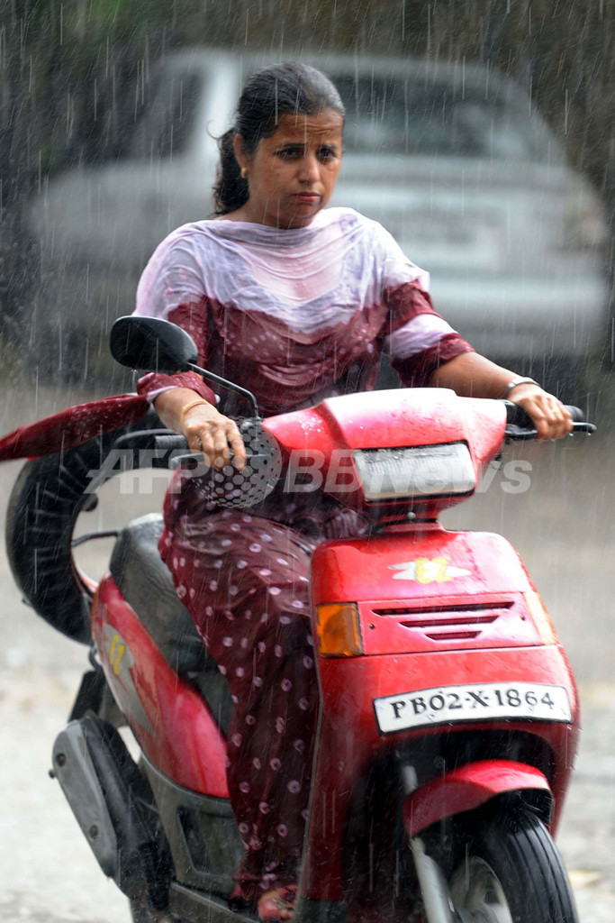 モンスーンの季節を迎えたインドでは、数日前から雨が降り続いているが、農家らはモンスーンの到来が遅すぎた点や、雨量が少なすぎる点を懸念している。6月の降水量は過去83年間で最少だった。これから雨が降っても、既に被害は出ており、穀物も今後影響を受けるだろうという不安の声が上がっている。写真は、アムリツァル(Amritsar)で雨の中スクーターに乗る女性(2009年7月29日撮影)。(c)AFP/NARINDER NANU