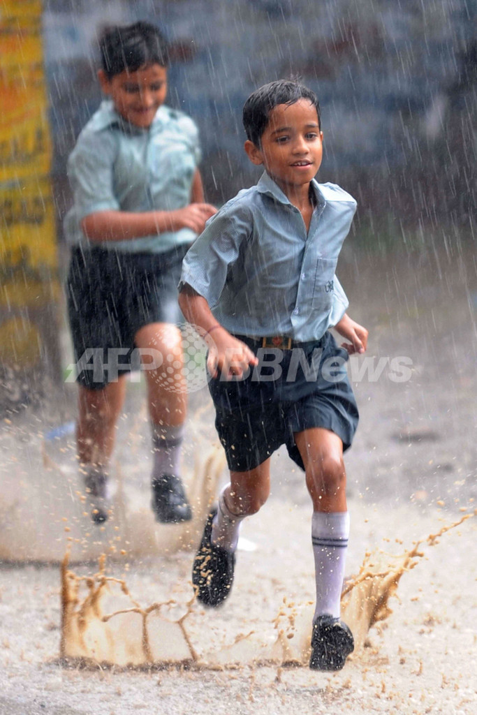 モンスーンの季節を迎えたインドでは、数日前から雨が降り続いているが、農家らはモンスーンの到来が遅すぎた点や、雨量が少なすぎる点を懸念している。6月の降水量は過去83年間で最少だった。これから雨が降っても、既に被害は出ており、穀物も今後影響を受けるだろうという不安の声が上がっている。写真は、アムリツァル(Amritsar)で雨の中を走る児童(2009年7月29日撮影)。(c)AFP/NARINDER NANU