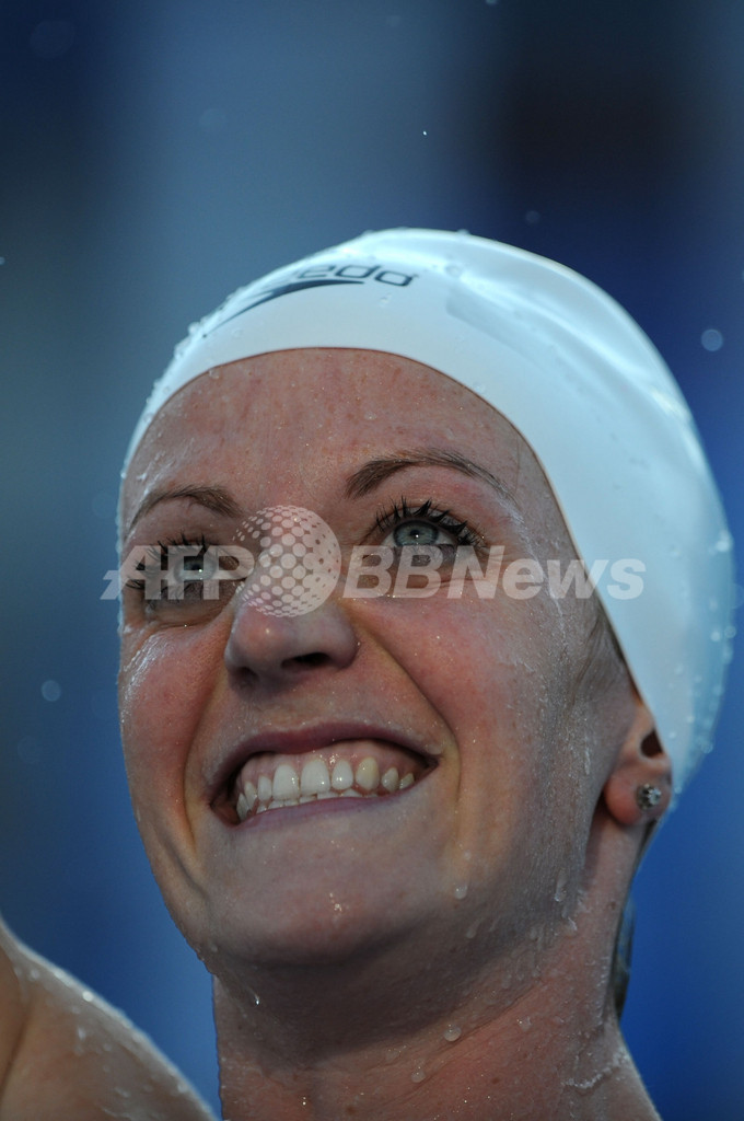第13回世界水泳選手権(%%13th World Swimming Championships%%)競泳女子200メートル平泳ぎ準決勝。カナダのアナメイ・ピアース(%%Annamay Pierse%%)が世界新記録となる2分20秒12を記録し、全体トップで決勝に進出した。日本の田村菜々香(%%Nanaka Tamura%%)は2分22秒83で7位、金藤理絵(%%Rie Kaneto%%)は2分22秒92で8位に入り、決勝に進出している。写真はレース後に歓喜するアナメイ・ピアース。(2009年7月30日撮影)(c)AFP/CHRISTOPHE SIMON