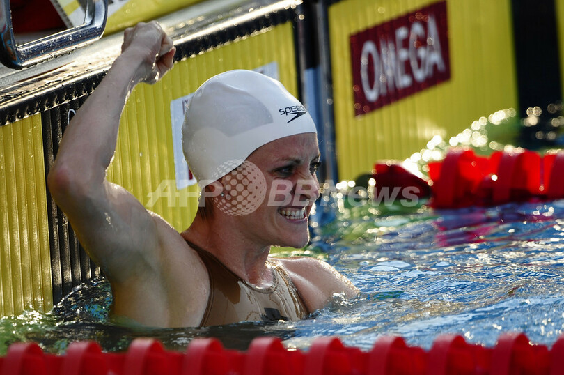 第13回世界水泳選手権(%%13th World Swimming Championships%%)競泳女子200メートル平泳ぎ準決勝。カナダのアナメイ・ピアース(%%Annamay Pierse%%)が世界新記録となる2分20秒12を記録し、全体トップで決勝に進出した。日本の田村菜々香(%%Nanaka Tamura%%)は2分22秒83で7位、金藤理絵(%%Rie Kaneto%%)は2分22秒92で8位に入り、決勝に進出している。写真はレース後に歓喜するアナメイ・ピアース。(2009年7月30日撮影)(c)AFP/CHRISTOPHE SIMON