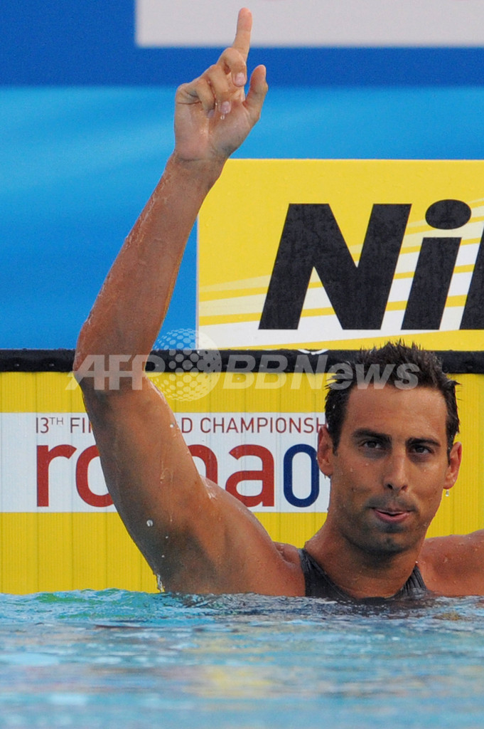 第13回世界水泳選手権(%%13th World Swimming Championships%%)競泳男子100メートルバタフライ準決勝。セルビアのミロラド・カビッチ(%%Milorad Cavic%%)が世界新記録となる50秒01を記録し、全体1位で決勝に進出した。カビッチは全米選手権(%%2009 ConocoPhillips USA Swimming National Championships%%)兼第13回世界水泳選手権代表選考会(%%13th FINA World Swimming Championships Trials%%)でマイケル・フェルプス(%%Michael Phelps%%)が樹立した世界記録50秒22を更新した。フェルプスは50秒48で全体2位で決勝進出を果たしている。写真はレース後にアピールするミロラド・カビッチ。(2009年7月31日撮影)(c)AFP/MARTIN BUREAU