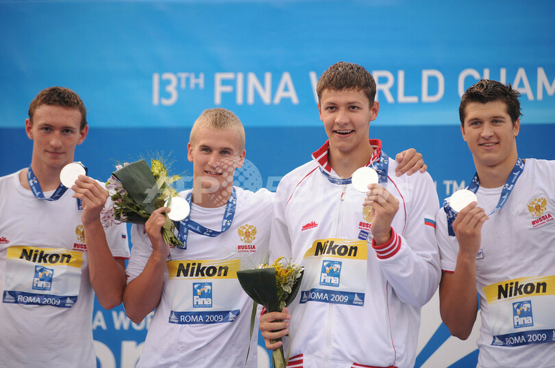 第13回世界水泳選手権(%%13th World Swimming Championships%%)競泳男子4x200メートルリレー決勝。米国が6分58秒55の世界記録で優勝した。2位には6分59秒15でロシアが、3位には7分1秒65でオーストラリアが入り、日本は7分2秒26で4位に終わった。写真はメダルを手にポーズをとるロシアの選手たち。(2009年7月31日撮影)(c)AFP/MARTIN BUREAU