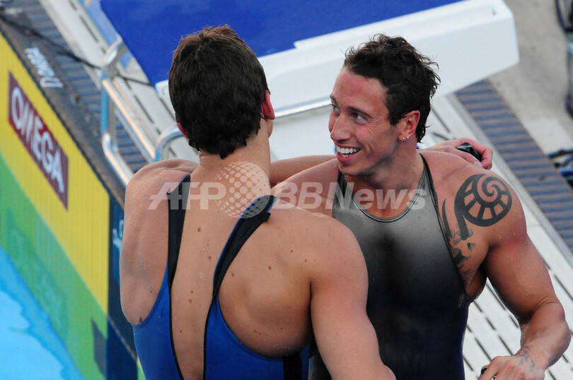 2位には21秒21で同種目世界記録保持者フレッド・ブスケ(%%Fred Bousquet%%、フランス)、3位には21秒25でアモリー・ルボー(%%Amaury Leveaux%%、フランス)が入った。写真は競技を終えてフレッド・ブスケから祝福されるセザル・シエロ・フィーリョ(左)。(2009年8月1日撮影)(c)AFP/ALBERTO PIZZOLI