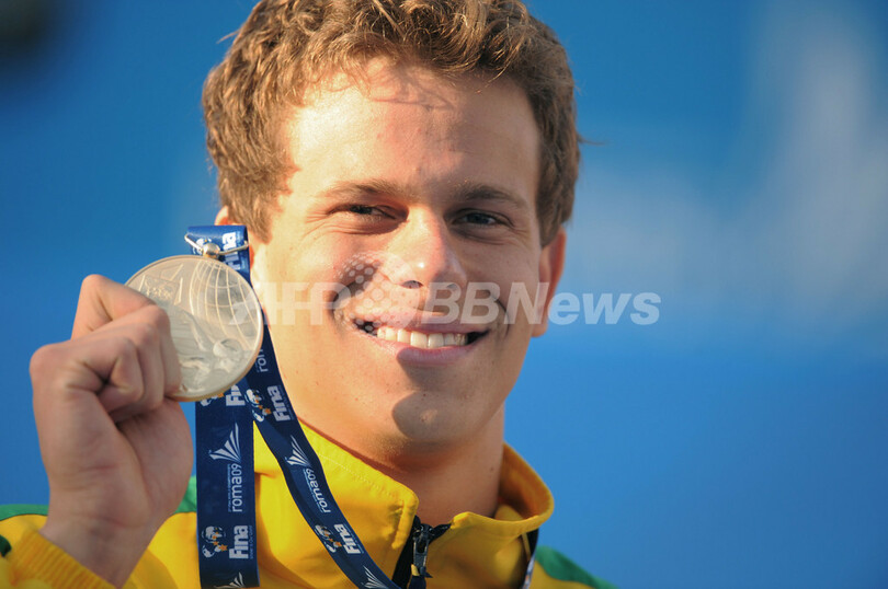 2位には21秒21で同種目世界記録保持者フレッド・ブスケ(%%Fred Bousquet%%、フランス)、3位には21秒25でアモリー・ルボー(%%Amaury Leveaux%%、フランス)が入った。写真は表彰式でポーズをとる優勝したセザル・シエロ・フィーリョ。(2009年8月1日撮影)(c)AFP/MARTIN BUREAU