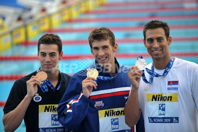 2位には49秒95を記録したカビッチが、3位には50秒41を記録したラファエル・ムニョス(%%Rafael Munoz%%、スペイン)が入った。写真は表彰式に臨む(左から)、3位のラファエル・ムニョス、優勝したマイケル・フェルプス、2位のミロラド・カビッチ。(2009年8月1日撮影)(c)AFP/CHRISTOPHE SIMON